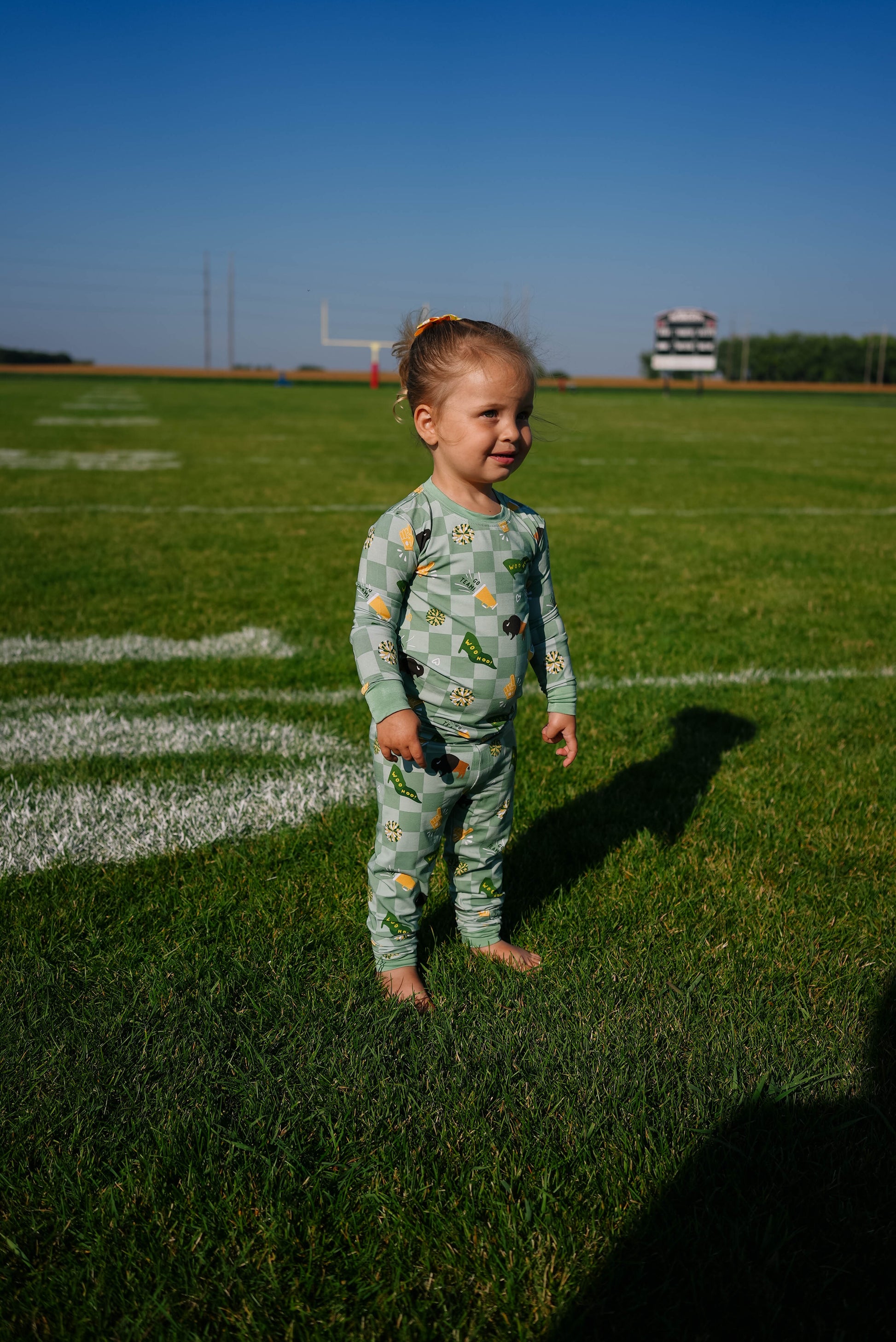 Cheer on your local team in cozy style with our Green & Gold Rally Two Piece Pajama Set! This spirited design celebrates team pride with bold green and gold—perfect for little fans who love to lounge, play, and cheer on their favorite sports heroes.